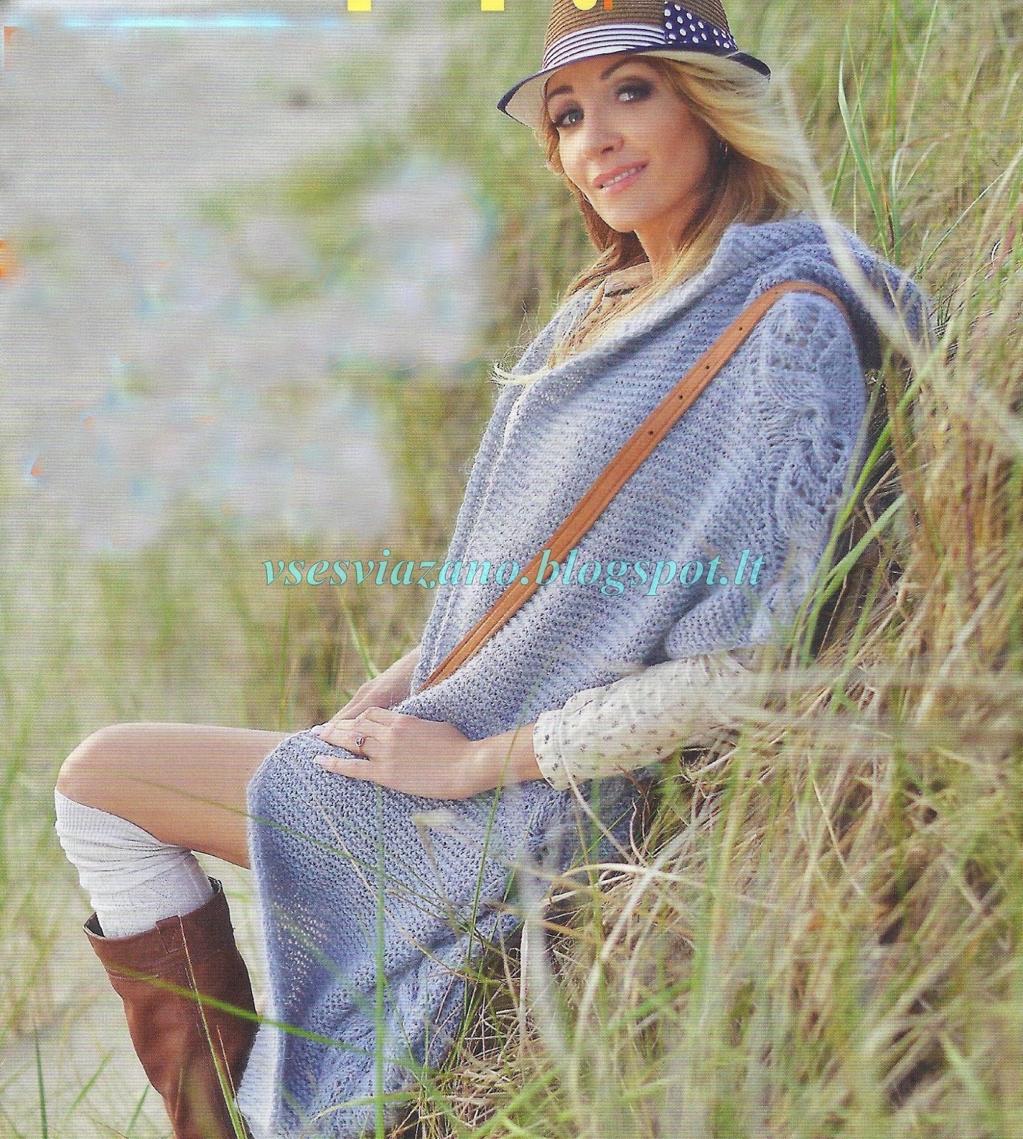 Так вяжите до длины в 57 см, после чего косы с крав снимите на вспомогательную спицу и вяжите отдельно еще 22 см. Другие петли дальше тоже вяжите платочной вязкой, однако с обеих краев в каждом втором ряду прибавьте по 2 петли 11 раз ( всего с обеих краев прибавите по 22 петли). Эти прибавляемые петли на выкройке помечены птичкой. Косы, которые Вы вязали отдельно, аккуратно пришейте к полотну. Далее все петли ( 80+22+22+2 кромочные) вяжите прямо платочной вязкой 12 см, после чего с обеих сторон закройте по 2 петли в каждом втором ряду, пока в середине не останется 40 петель для выреза горловины.